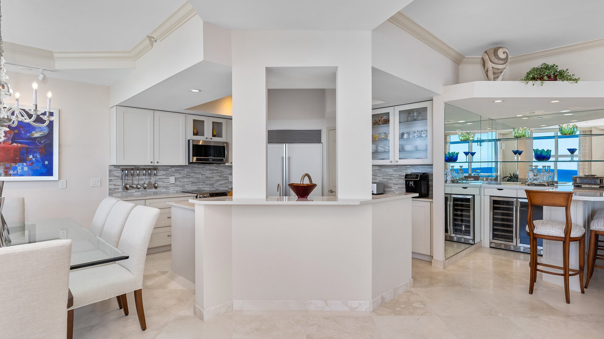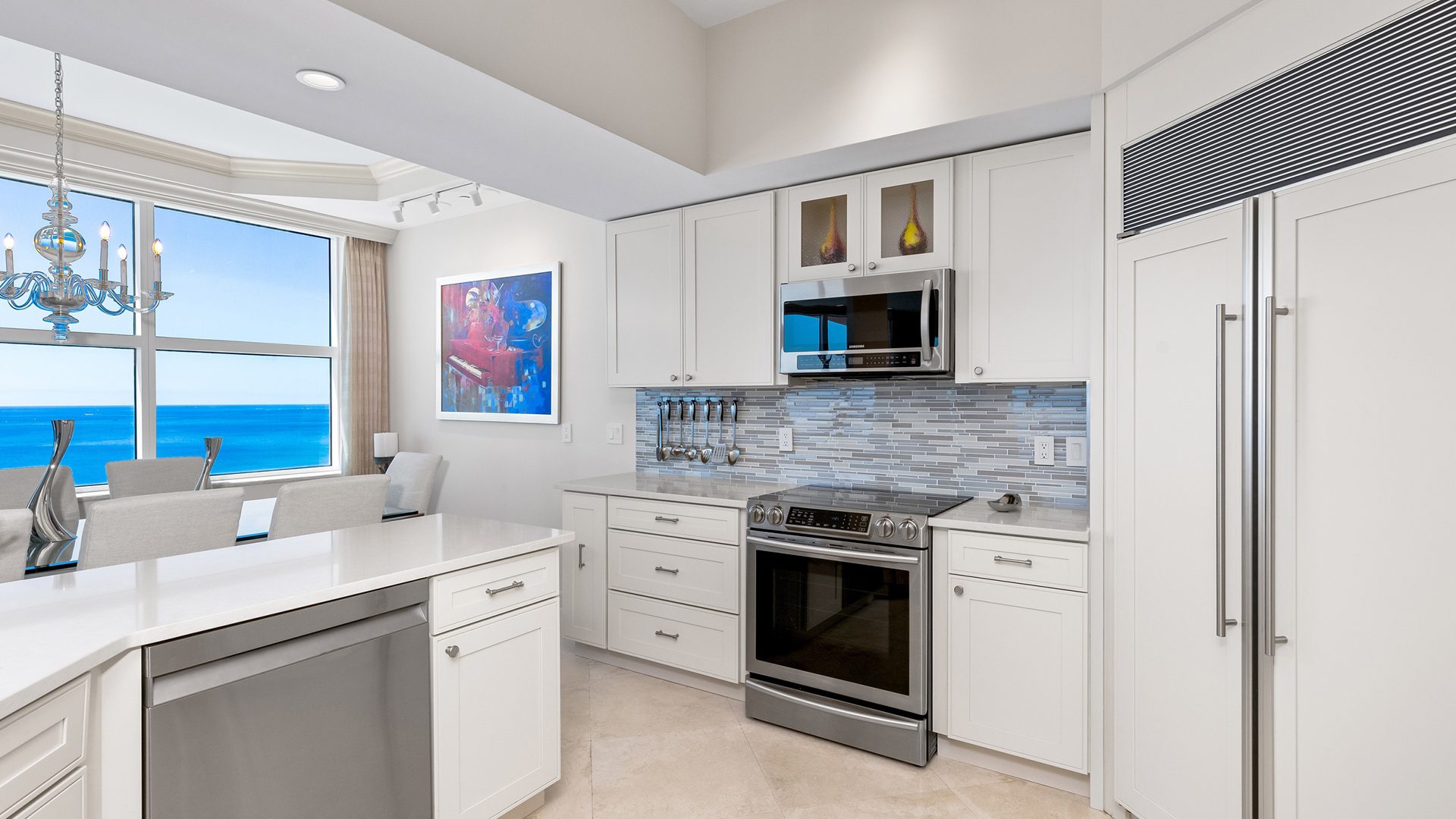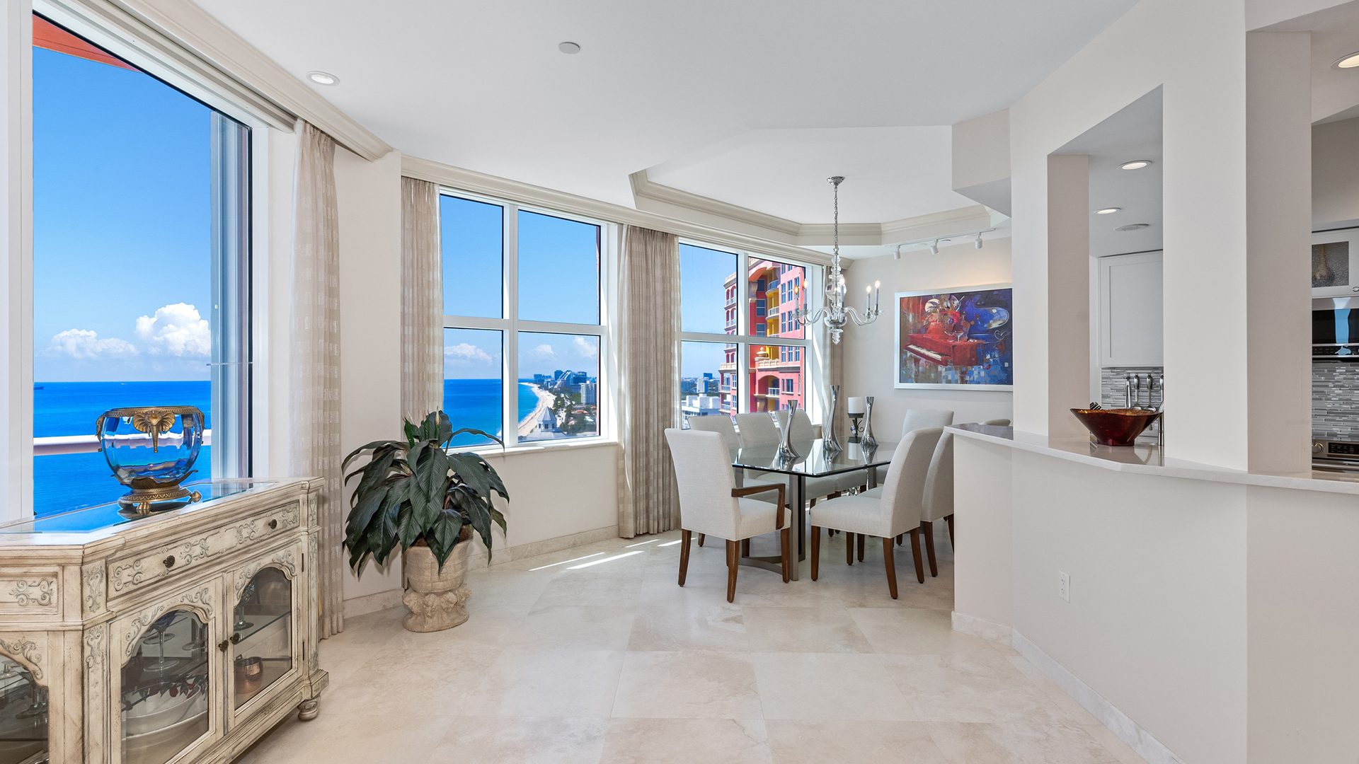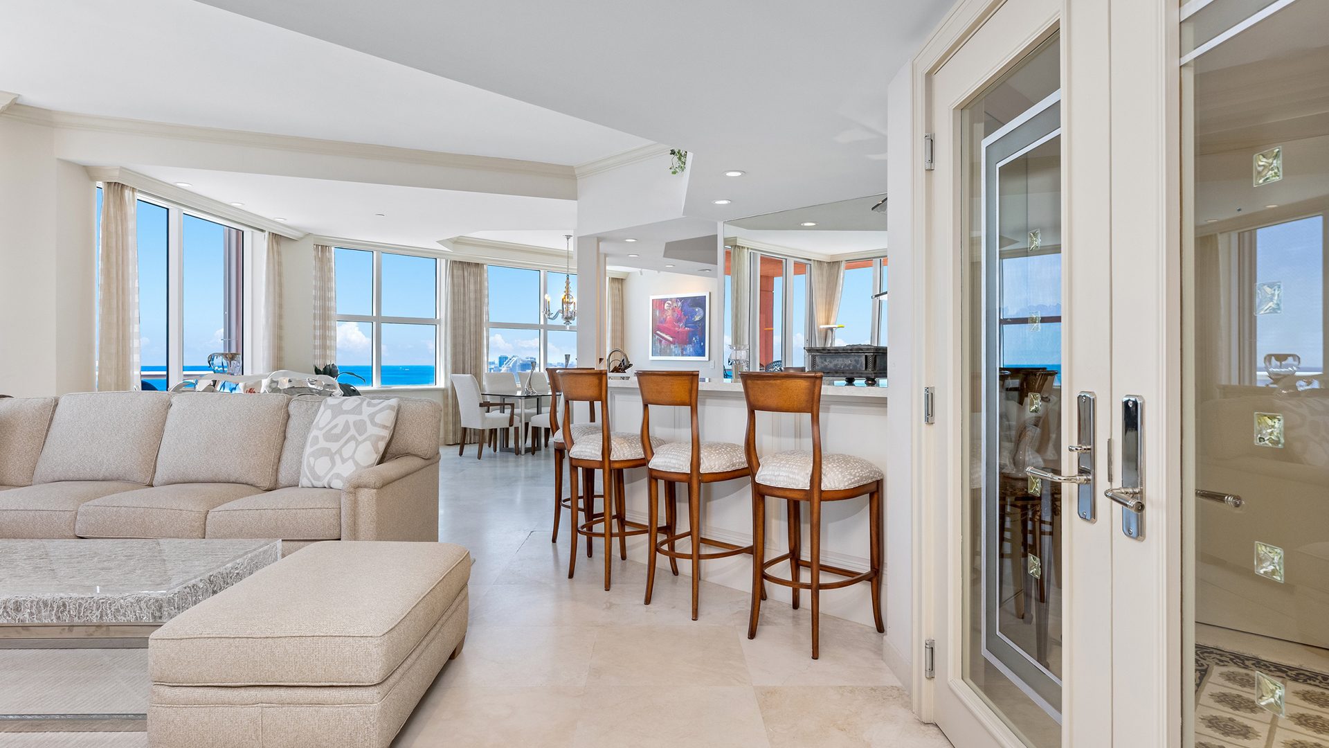 Step into an open-concept living space where elegance meets comfort. The great room flows seamlessly into the dining area and designer kitchen, ideal for entertaining or relaxing while taking in the breathtaking ocean vistas. Two private terraces invite you to enjoy spectacular sunrises over the water and glowing sunsets over the city — the perfect backdrop for South Florida living.