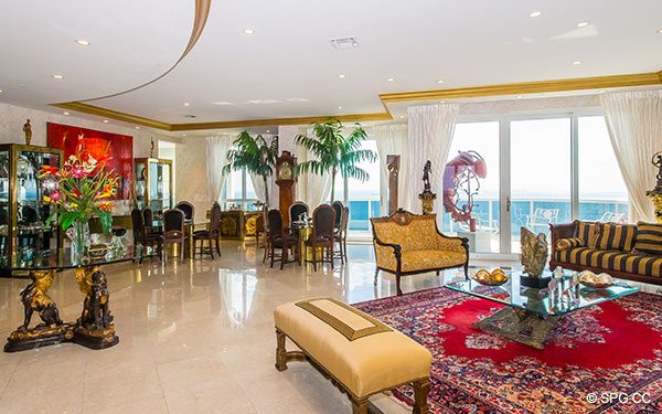The residence is located at L’Hermitage in beautiful Fort Lauderdale, resting on ten acres and 650 feet of exquisite beachfront property. The elegant resort community at L’Hermitage offers a lifestyle rich in amenities, service, and convenience. Among the many outstanding amenities are the private beach club, the two lagoon-style pools, relaxing whirlpool spas, a gorgeous landscaped tropical garden, and charming poolside cafe’.