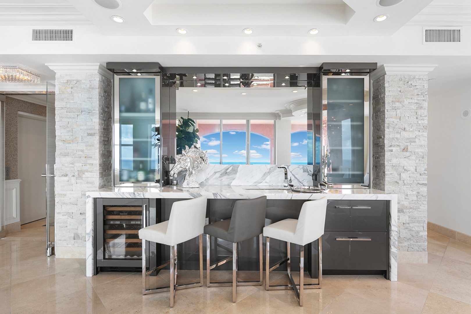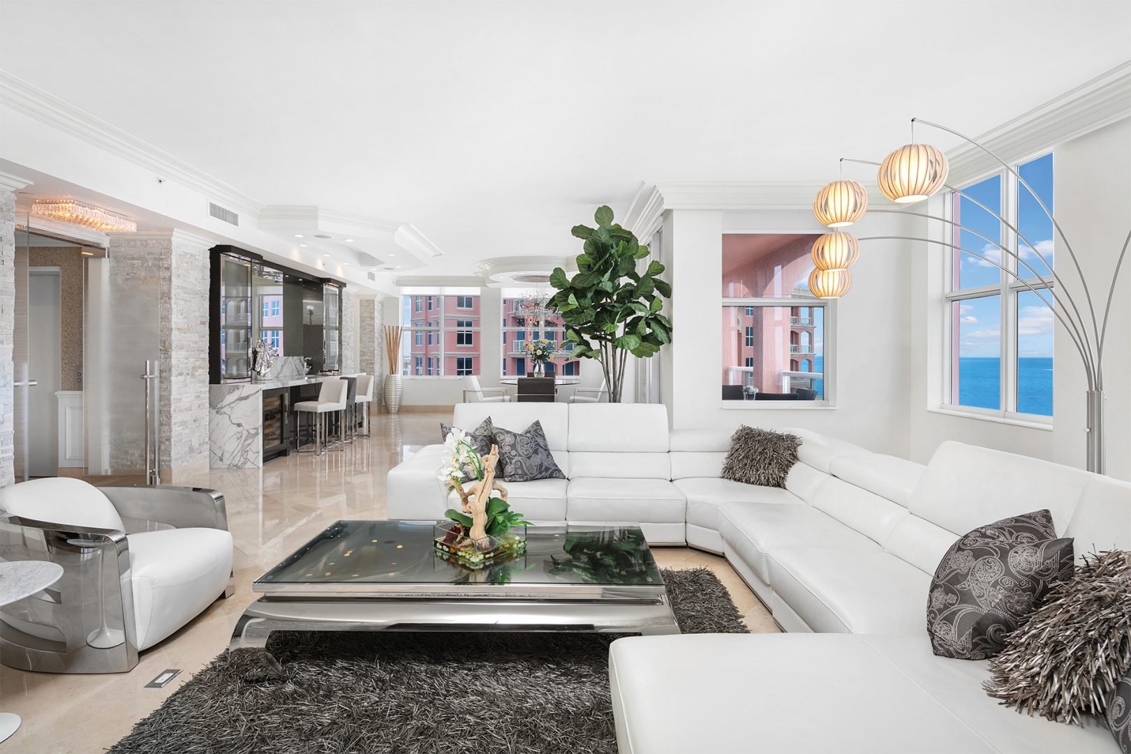 2100 N Ocean Blvd 26A, Fort Lauderdale, FL 33305 - Discerning luxury buyers will appreciate the exquisite attention to detail paid in this spectacular newly renovated penthouse soaring 26 floors above the ocean at The Palms in beautiful Fort Lauderdale. This contemporary masterpiece boasts soaring 'forever' views of the ocean, city and Intracoastal. The spectacular views of the sea and skyline beckon you to linger on one of the three separate sky terraces. This magnificent penthouse residence features 4 spacious bedroom suites, 5.5 baths, 10 foot ceilings and a 42 foot wide oversized living room complete with custom bar. The fully equipped gourmet kitchen features high-end custom cabinetry, countertops with Sub-Zero and Wolf appliances. The master suite boasts his and her master baths with a 49 square foot walk-in shower, a separate luxurious spa tub and huge beautifully appointed walk in closets. This remarkable oceanfront penthouse represents the epitome of luxury, elegance and sophistication.