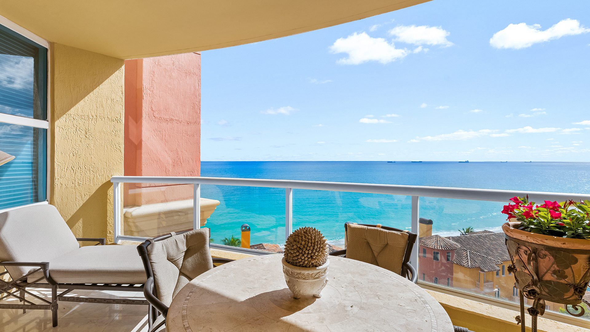 Step inside and be greeted by an open, airy layout featuring marble and carpet flooring, built-in features, and an elegant kitchen with a spacious island. The split-bedroom design offers privacy, while the walk-in closets provide ample storage. The primary suite boasts floor-to-ceiling windows that frame the endless blue waters, creating a serene retreat.