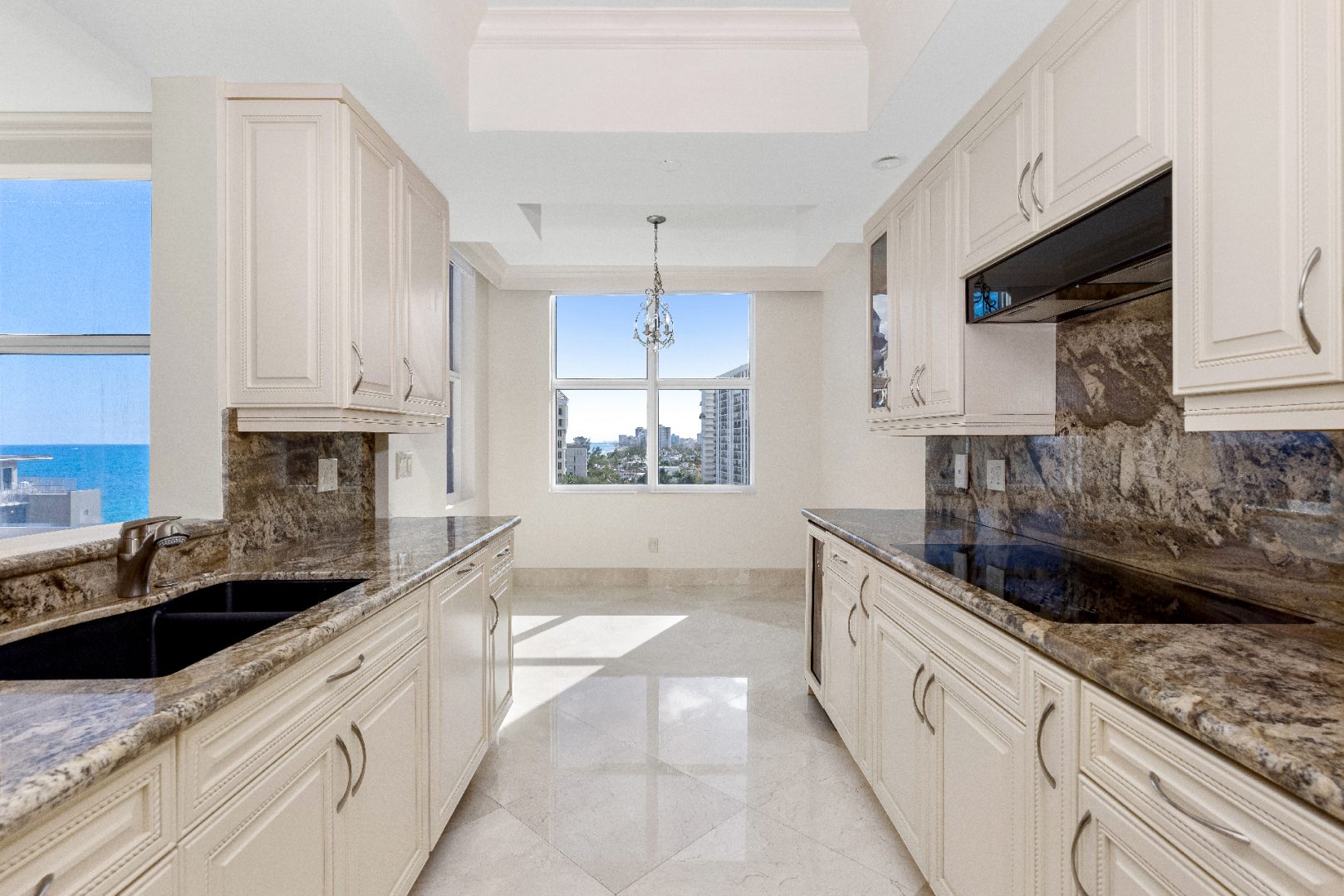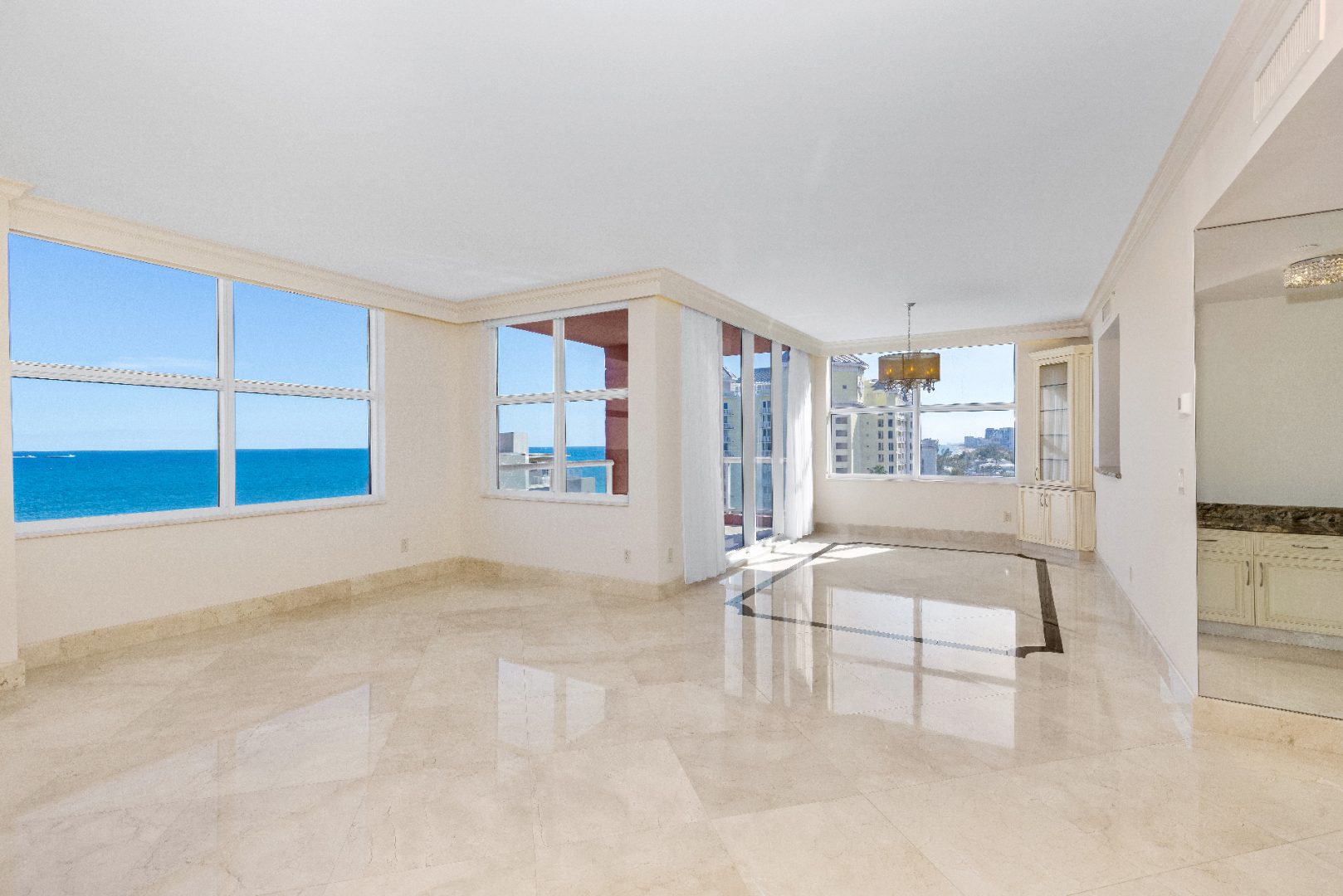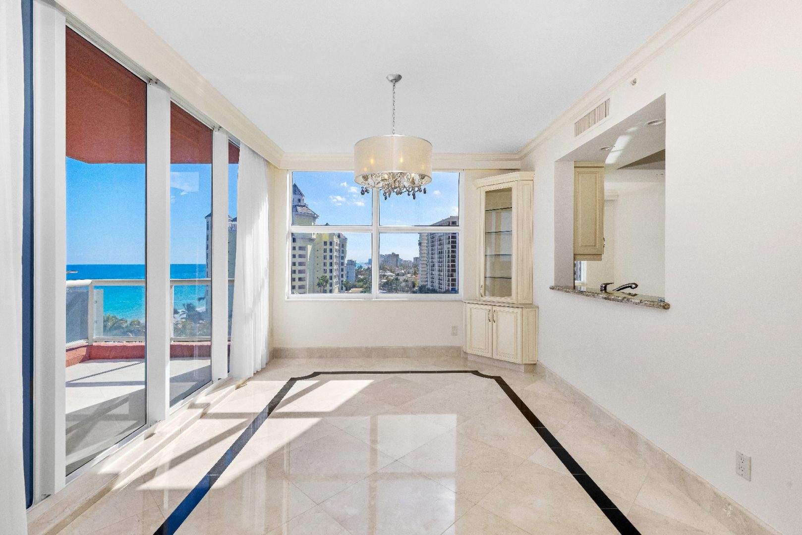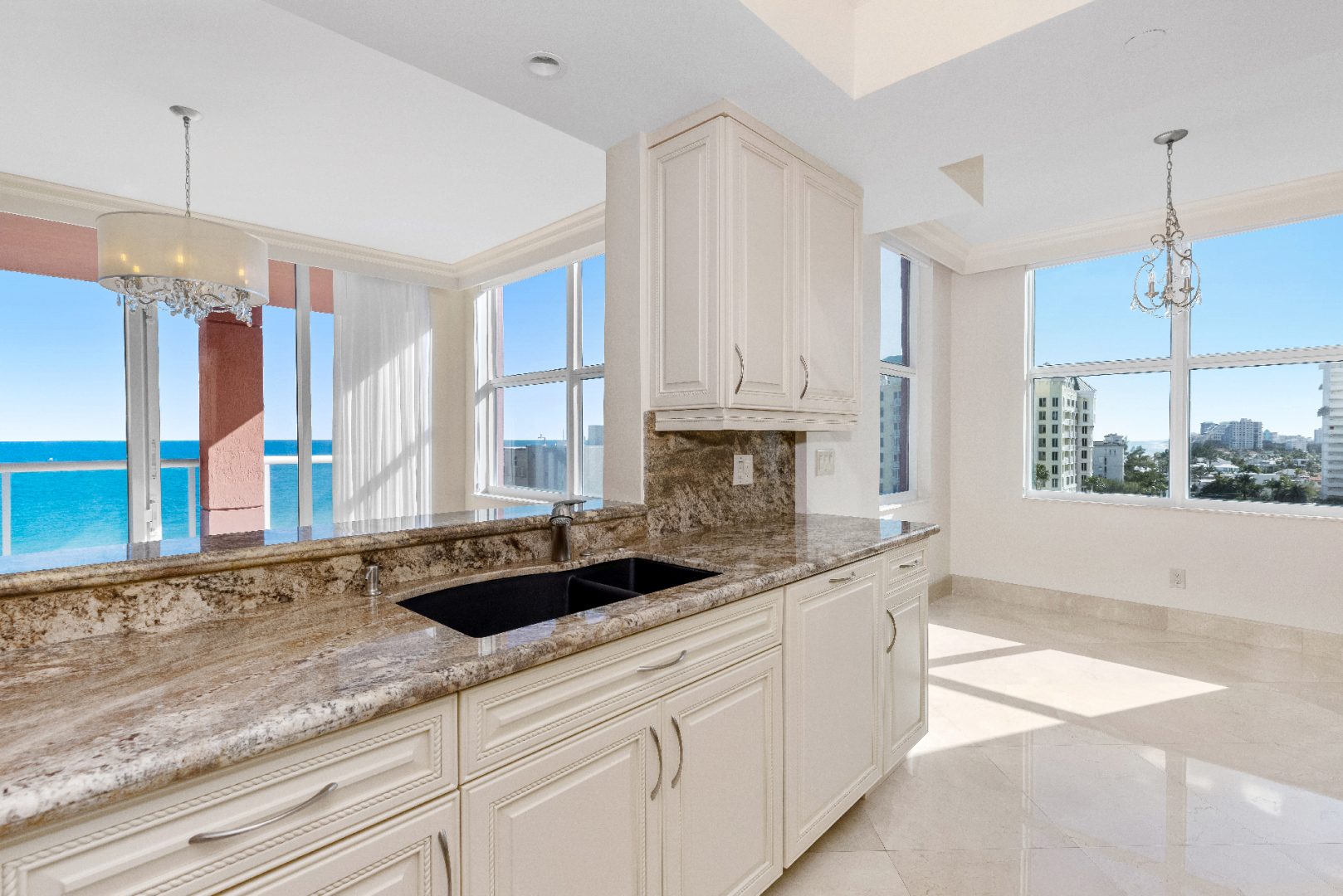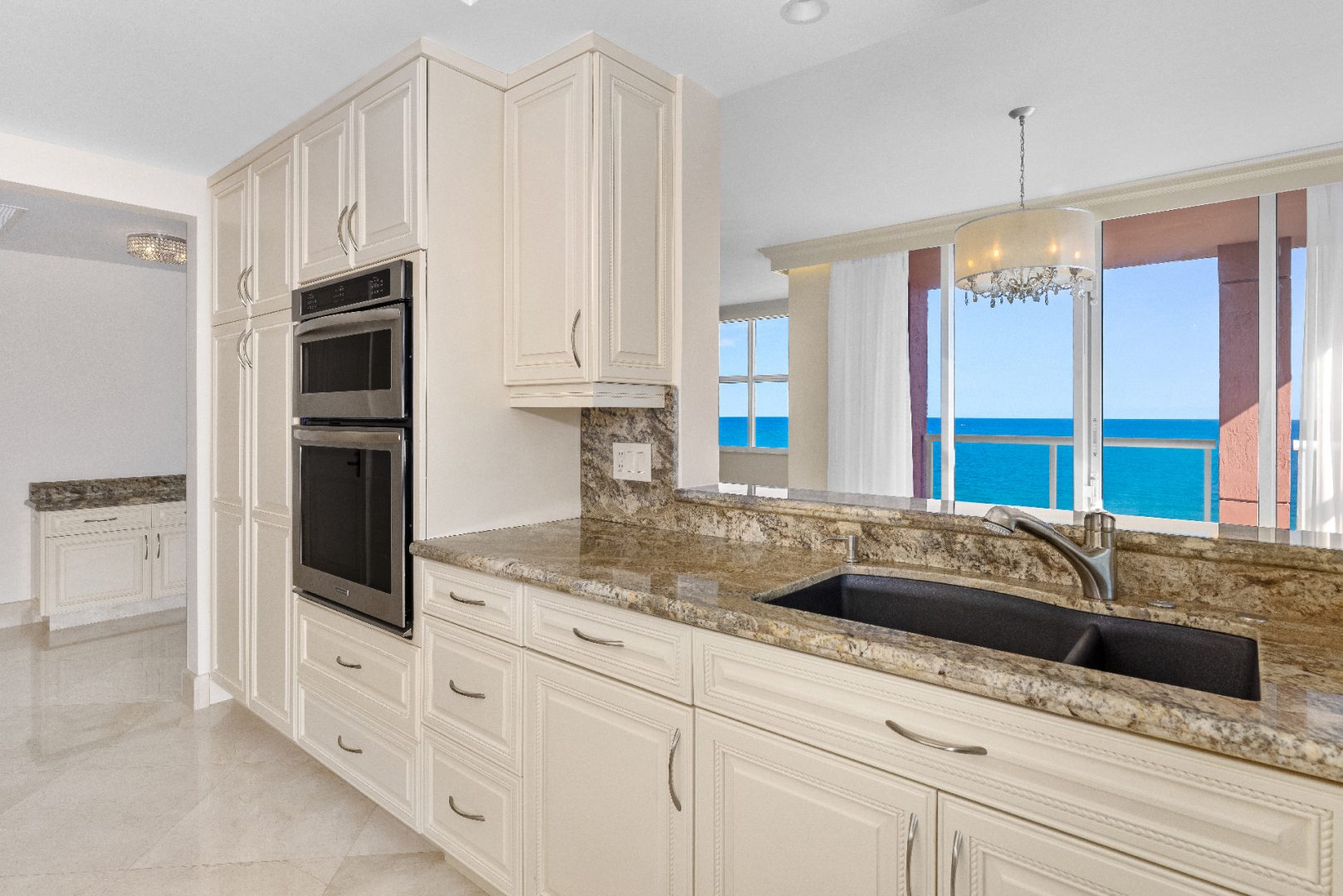 Spanning 1,604 sq. ft., this corner unit is designed for both elegance and comfort, featuring marble flooring, an open floor plan, and floor-to-ceiling windows that frame the endless blue horizon. The primary suite is a private oasis, offering direct ocean views, a spa-inspired ensuite bathroom, and ample closet space. The gourmet kitchen is outfitted with high-end appliances, sleek cabinetry, and a breakfast bar, making it perfect for casual dining or entertaining guests.